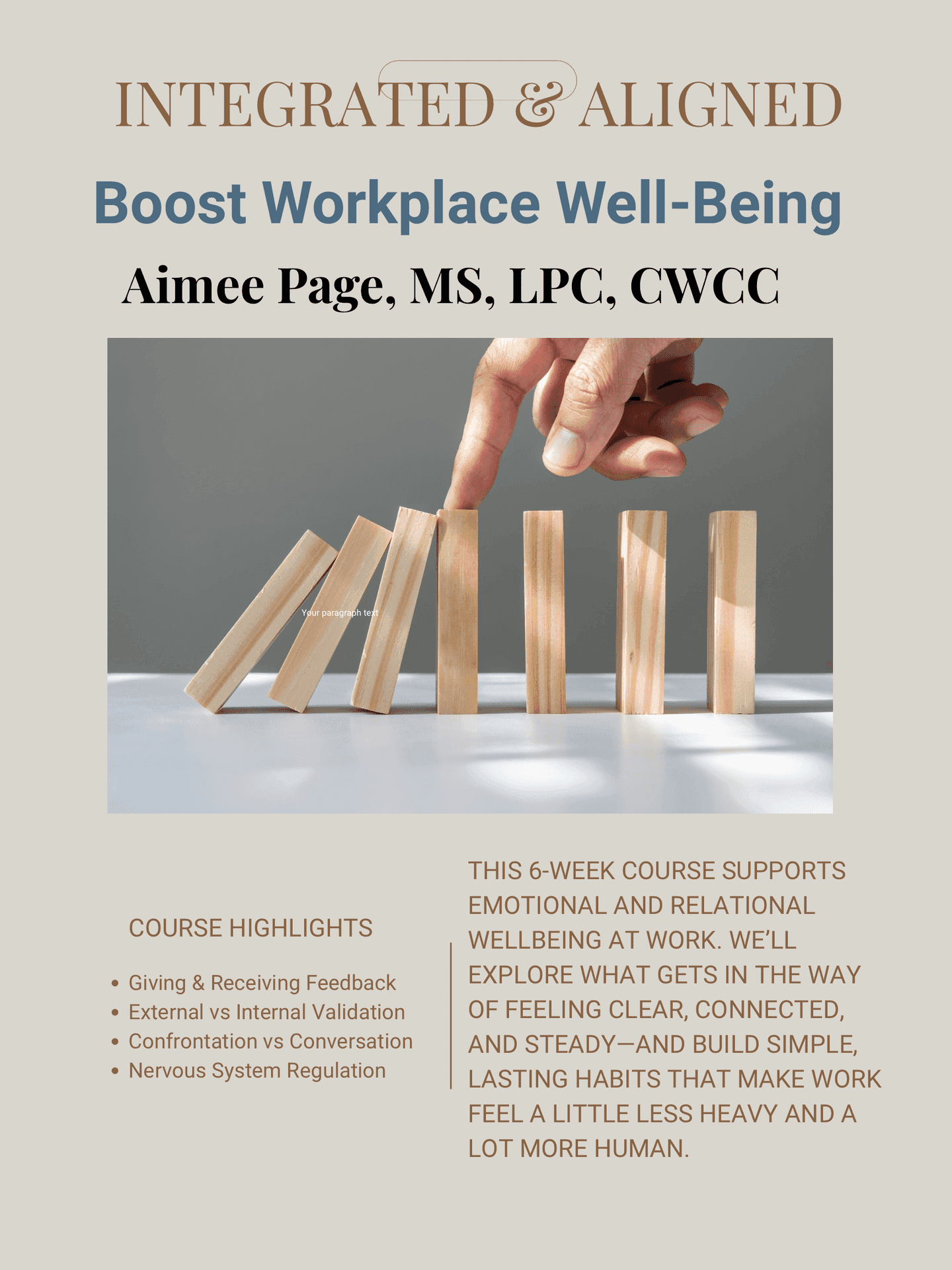6-Week Corporate Wellness Program — This isn’t your typical wellness program. Over 6 weeks, we’ll explore how our internal parts influence how we show up at work, how distorted thinking keeps us stuck, and how self-compassion can shift the way we relate—to ourselves and each other. The goal? Less self-criticism, more understanding, and a healthier, more human way of working